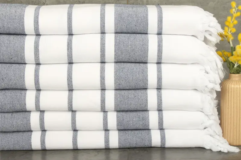 Characterized by 100% organic Turkish cotton, these towels are distinguished by their natural dyeing process, ensuring consistent and vibrant color retention. Measuring 36x67 inches or 90x170 centimeters, each towel weighs 450 grams, resulting in a balanced blend of lightness and durability. The hand-weaving process allows for tolerances of 1-2.5 cm, providing a slight variance in dimensions.