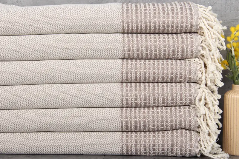 The Turkish towels and blankets are characterized by their %100 organic Turkish cotton composition, ensuring a natural and environmentally friendly fiber source. The towels exhibit remarkable absorbency, attributed to their organic cotton fibers that become progressively more absorbent with each wash. Each piece measures 36x69 inches (90x175 centimeters) and weighs 420 grams, with slight hand-weaving tolerances of 1-2.5cm.