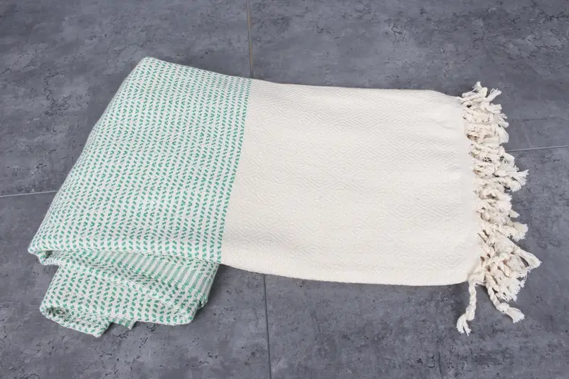The Turkish Beach Towel is characterized by 100% organic Turkish cotton, ensuring a high degree of absorbency and durability. Weighing 450 grams, this towel features dimensions of 40x71 inches or 100x180 centimeters, and it exhibits a slight hand-weaving tolerance of 1-2.5 centimeters.
