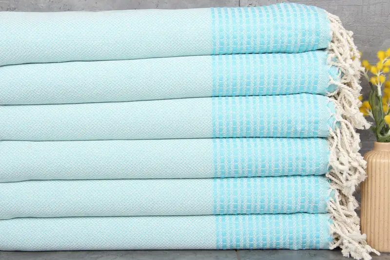 Turkish towels are characterized by their organic cotton composition, ensuring a natural dyeing process. These towels, sized 36x69 inches (90x175 centimeters), weigh 420 grams and have a pre-shrunk status. Hand-weaving tolerances are between 1-2.5 centimeters.