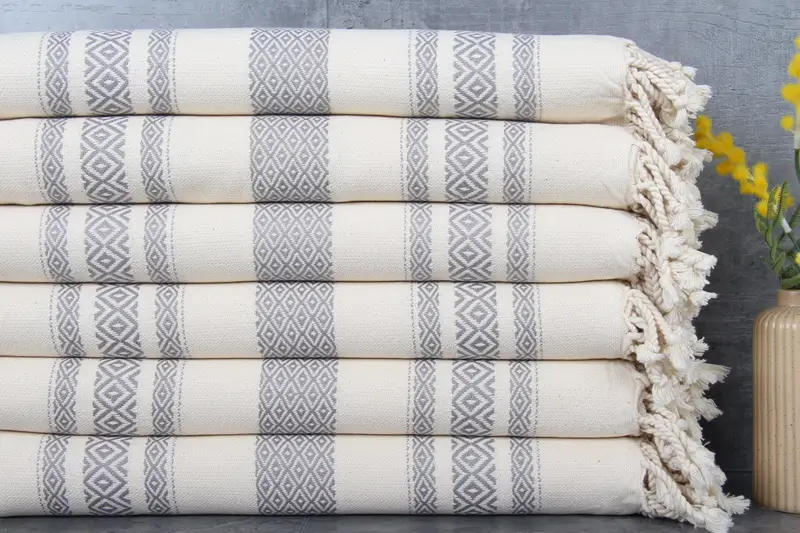 Featuring %100 organic Turkish cotton, these towels are characterized by exceptional absorbency, ensuring they become increasingly absorbent with each wash. The towels, measuring 36x71 inches or 90x180 centimeters, weigh 400 grams and are hand-woven with allowable tolerances of 1-2.5cm.