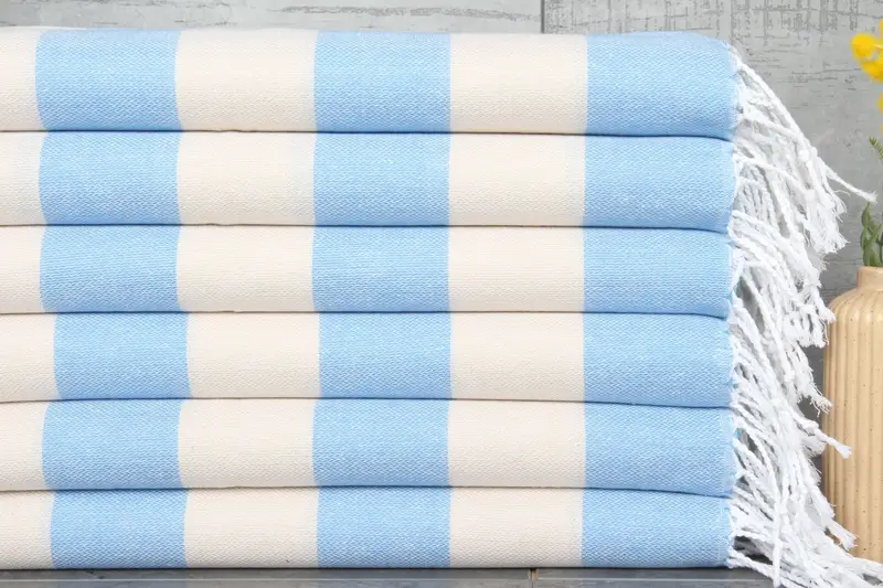 Turkish towels and blankets are characterized by their natural fiber composition, made from 100% organic Turkish cotton and natural dyes. Resulting in towels that, after washing, become increasingly absorbent. Each piece measures 18x40 inches or 45x100 centimeters, weighing 80 grams, with hand-weaving tolerances of 1-2.5 centimeters.