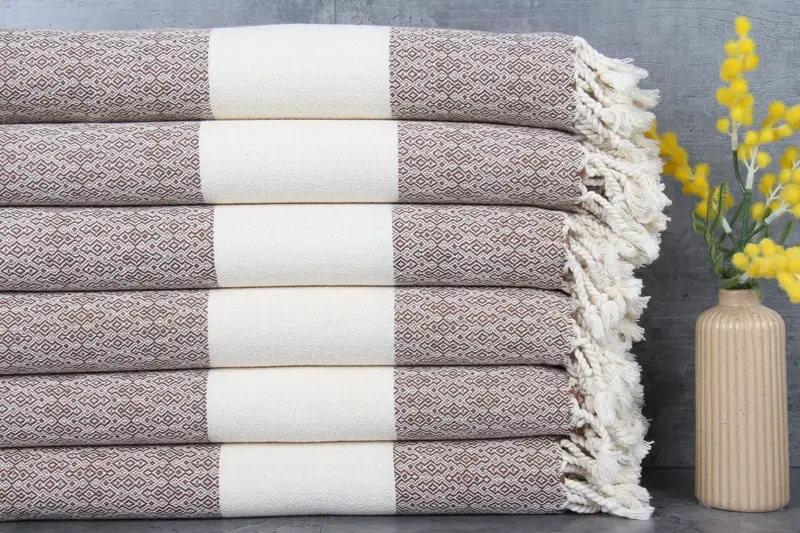 Dimensions for these towels are specifically 36x67 inches (90x170 centimeters), maintaining a weight of 340 grams. Their pre-shrunk nature ensures minimal shrinkage after washes. Hand-weaving introduces a tolerance of 1-2.5 cm for each piece.