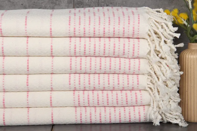 Comprising 100% organic Turkish cotton, the towels are characterized by high absorbency and durability. Their fiber composition ensures that each wash enhances water absorption, resulting in progressively softer towels. Each piece measures 38x71 inches (95x180 centimeters) and weighs 420 grams, allowing for a consistent hand-weaving tolerance of 1-2.5 cm.