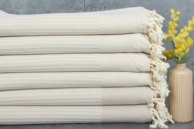 The Turkish Beach Towels are characterized by their organic cotton composition, weighing 280 grams and available in dimensions of 40x67 inches or 100x170 centimeters. The towels are produced with 100% organic Turkish cotton, ensuring natural dyes and an expected deviation of 1-2.5 cm in hand-weaving. Towels require separate washing for the first 2-3 washes, followed by combined washing at 30-40°C.