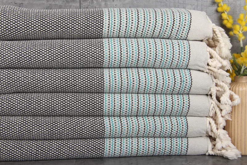 The Turkish towels and blankets are characterized by their superior fiber composition, made entirely from 100% organic Turkish cotton. This ensures a high level of absorbency, enhancing functionality and durability over multiple washes. Additionally, they are pre-shrunk, minimizing potential dimensional changes post-wash.