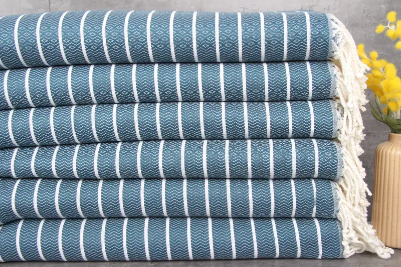 The Turkish towels are characterized by their %100 organic Turkish cotton composition, ensuring high absorbency and natural dye color retention. These towels are meticulously hand-woven, resulting in dimensions of 40x71 inches or 100x180 centimeters, with a weight of 300 grams. Each towel exhibits a 1-2.5 cm tolerance due to the artisanal craftsmanship.
