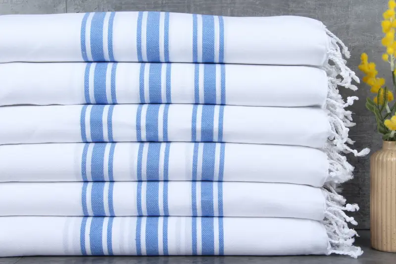 Turkish towels are characterized by their fiber composition, primarily made from 100% organic Turkish cotton, ensuring superior absorbency. Each towel, measuring 40x71 inches or 100x180 centimeters and weighing 280 grams, results in highly absorbent fibers that improve with each wash cycle. The hand-weaving process introduces tolerances of 1-2.5 centimeters, ensuring slight variations in dimensions.