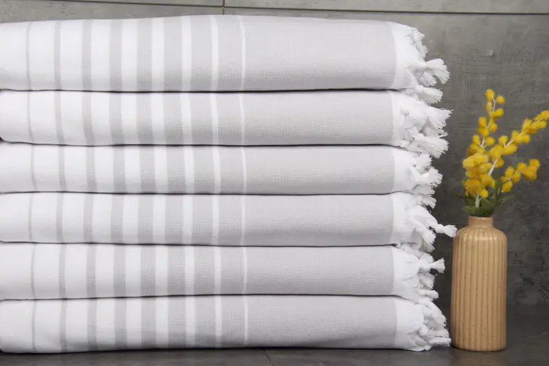 Characterized by its 100% organic Turkish cotton construction, the light gray striped beach towel offers superior absorbency and durability. The towels are made using natural dyeing techniques, ensuring a vibrant hue. Measuring 36x71 inches or 90x180 centimeters, these towels feature a weight of 400 grams, providing both comfort and strength. Tolerances in hand-weaving may result in slight variations of 1-2.5 centimeters.