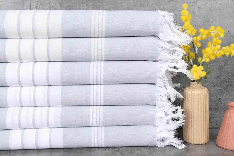 The Turkish Towels, crafted from 100% Organic Turkish Cotton, are distinguished by their high absorbency and durability. Characterized by GSM of 120 grams per square meter, these towels exhibit excellent water absorption, resulting in more absorbent fibers with each wash. The towels' dimensions span 40x70 inches or 100x180 centimeters, with allowable hand-weaving tolerances ranging between 1-2.5 cm.