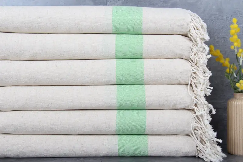 Turkish towels are made from 100% organic Turkish cotton, characterized by their natural dye process and high absorbency, ensuring durability and softness. Each towel weighs 280 grams, with dimensions of 36x71 inches (90x180 centimeters). Hand-weaving results in dimensional tolerances of 1-2.5 cm.