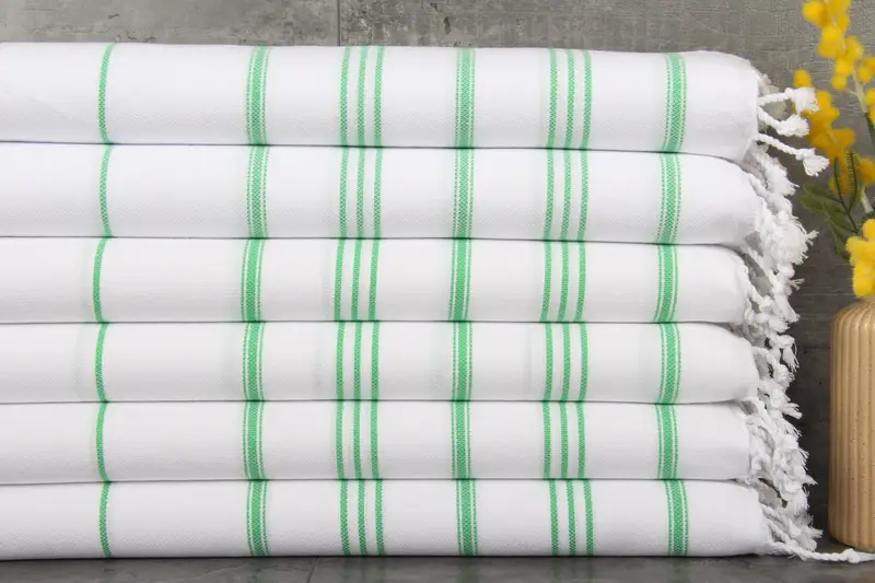Turkish towels are characterized by their absorbency and fiber composition, ensuring superior water absorption and softness. Made from 100% organic Turkish cotton with natural dyes, these towels feature a 24x36 inches (60x90 centimeters) size and a weight of 100 grams, allowing for a balance between portability and usability. Hand-weaving tolerances of 1-2.5 cm further enhance the quality and aesthetic appeal.