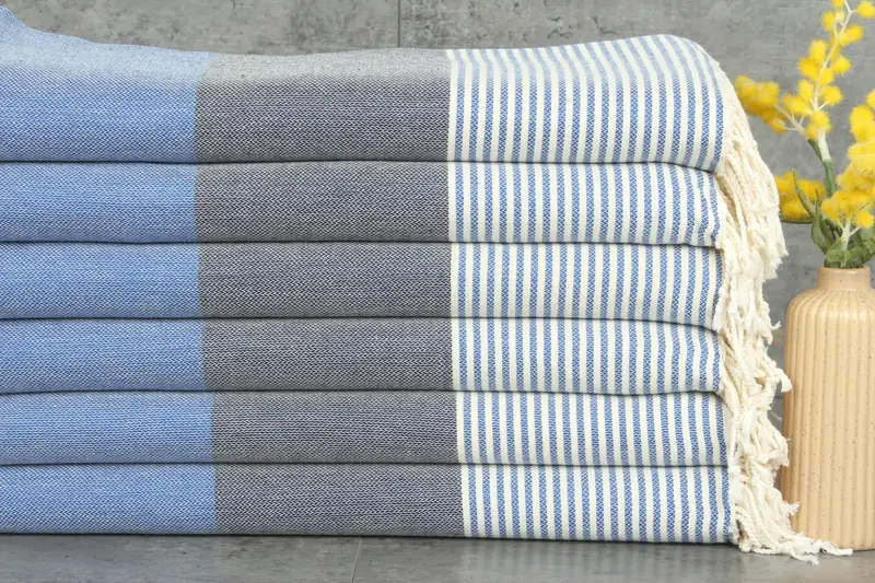 Turkish towels are crafted from 100% organic cotton, characterized by natural dyeing and a weight of 298 grams. They exhibit a soft texture and exceptional absorbency, ensuring that their cotton fibers absorb water more effectively after each wash, resulting in increased durability. Each towel measures 40x69 inches or 100x174 centimeters, with hand-weaving tolerances of 1-2.5 cm.