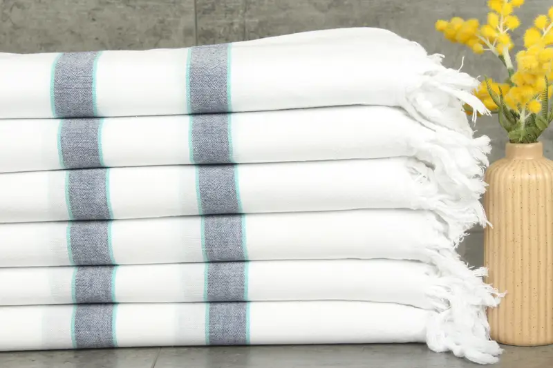 Composed of 100% organic Turkish cotton, the towel is characterized by its natural dyeing process, resulting in a soft and eco-friendly textile. Specifications reveal a dimension of 40x71 inches or 100x180 centimeters, and a weight of 300 grams. The hand-weaving method allows for variations of 1-2.5 centimeters in dimensions.