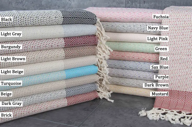 Turkish Towels ensure superior absorbency with their 100% Organic Turkish Cotton composition. Resulting in a GSM of 220 grams/sq. meters, these towels measure 40x70 inches or 100x180 centimeters, with a hand-weaving tolerance of 1-2.5cm. Each towel undergoes pre-shrinking for enhanced durability.