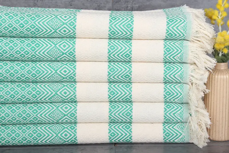 Composed of 100% organic Turkish cotton, the towels are naturally dyed, ensuring vibrant colors and superior quality. Characterized by high absorbency, these towels weigh 420 grams per piece, offering durability and softness. Each towel measures 70x40 inches or 100x180 centimeters, with hand-weaving resulting in tolerances of up to 1-2.5cm.