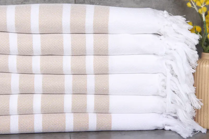 Constructed entirely from 100% organic Turkish cotton, ensuring durability and natural absorbency. Turkish Beach Towels are characterized by their 40x71 inches/100x180 centimeters dimensions and a weight of 380 grams, providing a balanced blend of softness and sturdiness. The hand-woven nature of the towels results in a tolerance of 1-2.5 cm in dimensions.