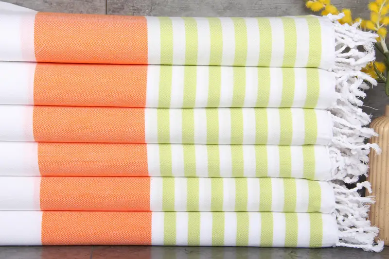 The towels are characterized by their fiber composition, entirely made from 100% organic Turkish cotton, ensuring natural dye colors and high absorbency. Each towel or blanket exhibits dimensions of 40x71 inches or 100x180 centimeters, with a weight of 280 grams. Variations in hand-weaving may result in tolerances of 1-2.5 cm.