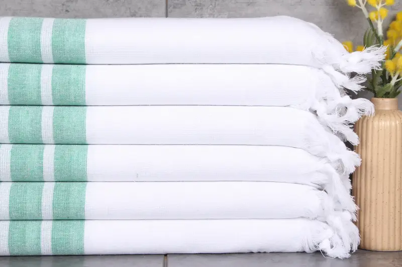 Characterized by superior absorbency, the Turkish Bath Towels are woven from 100% Organic Turkish Cotton, ensuring durability and softness. Dimensions are 40x71 inches or 100x180 centimeters, with a weight of 220 grams. Crafted through meticulous hand-weaving, tolerances of 1-2.5cm may occur.