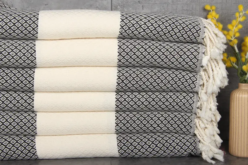 Our Turkish towels are characterized by 100% organic Turkish cotton, ensuring a high-quality material. These towels exhibit exceptional absorbency, becoming more absorbent with each wash, resulting in softer fibers over time. Fabric weight is 380 grams, with dimensions of 36x71 inches or 90x180 centimeters, and slight hand-weaving tolerances of 1-2.5cm.