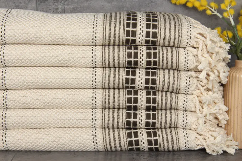 The Turkish towels are crafted using 100% organic Turkish cotton, ensuring an exceptional level of absorbency and softness. Characterized by their natural dyeing process, these towels demonstrate significant water absorption with each subsequent wash, resulting in improved texture over time. Measuring 38x65 inches or 95x165 centimeters and weighing 420 grams, each towel features a precision in hand-weaving with a tolerance of 1-2.5cm.