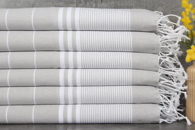 The product comprises organic Turkish cotton towels, ensuring durability and natural softness. Characterized by a weight of 120 grams and dimensions of 24x40 inches or 60x100 centimeters, each piece exhibits slight variations in size due to hand-weaving, typically within a tolerance of 1-2.5cm. Turkish towels undergo pre-washing and can be machine washed at 30-40 degrees Celsius with low cycles, enhancing absorbency over time.