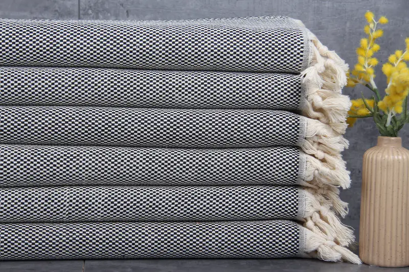 Organic cotton fibers ensure superior absorbency, characterizing the Turkish towels. Sized at 18x40 inches or 45x100 centimeters with a weight of 120 grams, these towels result in durable and soft textiles. Weaving tolerances account for variations of 1-2.5cm.