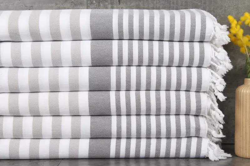 Our Turkish Bath Towel, Beach Towel, Striped Peshtemal, and Gray Scarf Towel, weighing 274 grams, are characterized by their 100% organic Turkish cotton composition, ensuring natural dyeing and enhanced absorbency after each wash. With dimensions of 40x75 inches (100x188 centimeters) and a tolerance of 1-2.5 cm due to hand-weaving, these towels provide a consistent and reliable size. Our fulfillment process includes the option for custom embroidery, pre-shrunk towels, and expedited shipping within 2-6 days, depending on the region, with bulk or...