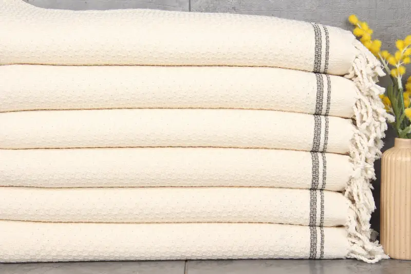 Turkish towels are characterized by their 100% organic cotton composition, resulting in high absorbency. The towels measure 36x67 inches (90x170 centimeters) and weigh 440 grams, with slight hand-weaving tolerances of 1-2.5 centimeters. Custom embroidery, pre-shrunk status, and prompt shipping are ensured, with USA/Canada delivery in 2-5 days and Europe in 2-4 days. Free shipping is available for orders over 35 USD, and a 2-day expedited option is possible upon request. Returns and exchanges are facilitated through direct communication.