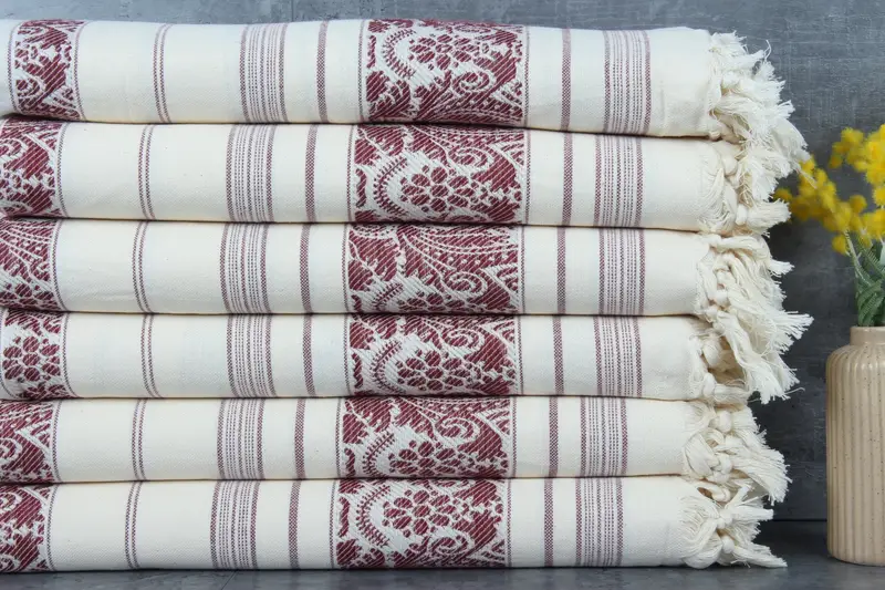 Characterized by 100% organic Turkish cotton, these towels are renowned for their superior absorbency and durability. Resulting in a weight of 300 grams, the towels are meticulously woven ensuring dimensions of 40x71 inches or 100x180 centimeters. This hand-weaving process allows for a tolerance of 1-2.5cm in size.