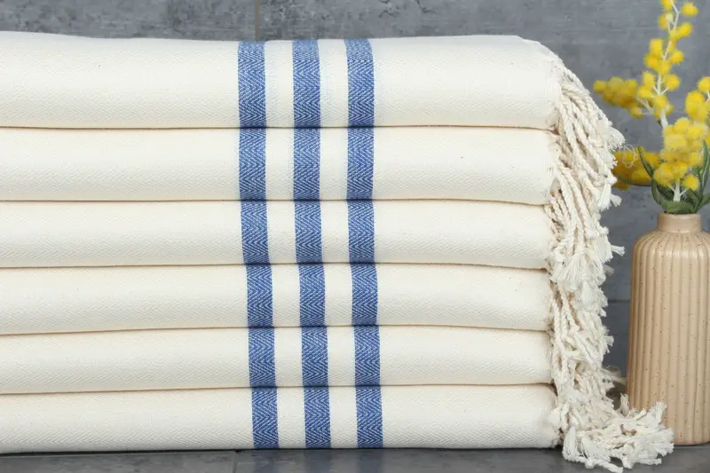 The Turkish towels are characterized by their 100% organic Turkish cotton fiber composition, ensuring natural dyeing and superior absorbency. Each towel exhibits a weight of 250 grams and dimensions of 40x71 inches or 100x180 centimeters, with hand-weaving tolerances of 1-2.5cm. Customization options are available for orders of 500-1000 pieces, with a pre-shrunk status for added convenience.