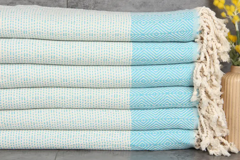 Turkish towels are composed of 100% organic Turkish cotton, ensuring natural dye colors and superior absorbency. Resulting in a weight of 380 grams, each towel measures 71x40 inches or 180x100 centimeters. Hand-weaving introduces variations of up to 2.5 cm.