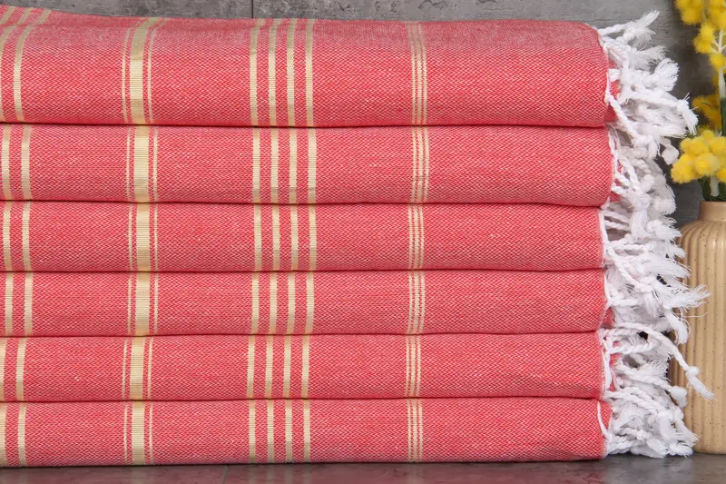 The personalized Turkish beach towel is crafted from 100% organic Turkish cotton, ensuring a natural fiber composition. Each towel features a red-yellow color palette with beige as a secondary tone and boasts a weight of 260 grams, ensuring durability and softness. Measuring 40x71 inches or 100x180 centimeters, the towel's hand-woven construction allows for tolerances of 1-2.5 cm in dimensions, providing a handmade finish.