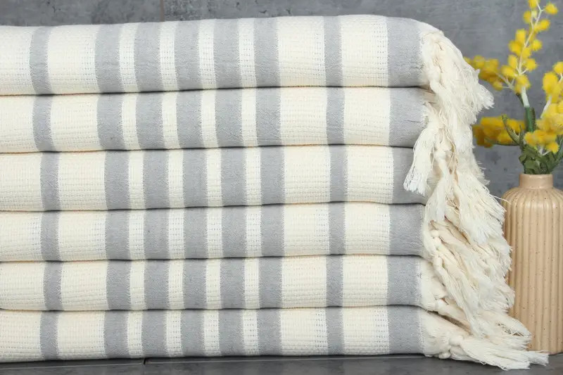 Featuring a blend of organic cotton, this striped towel ensures durability and sustainability, characterized by a weight of 320 grams. Resulting in superior absorbency, dimensions of the towel are 70x34 inches or 180x85 centimeters, with slight hand-weaving tolerances of 1-2.5 centimeters. Regarding logistics, the product can be customized with monograms or personalized designs, and pre-shrunk towels are shipped within two days for international orders, allowing for convenient returns or exchanges.
