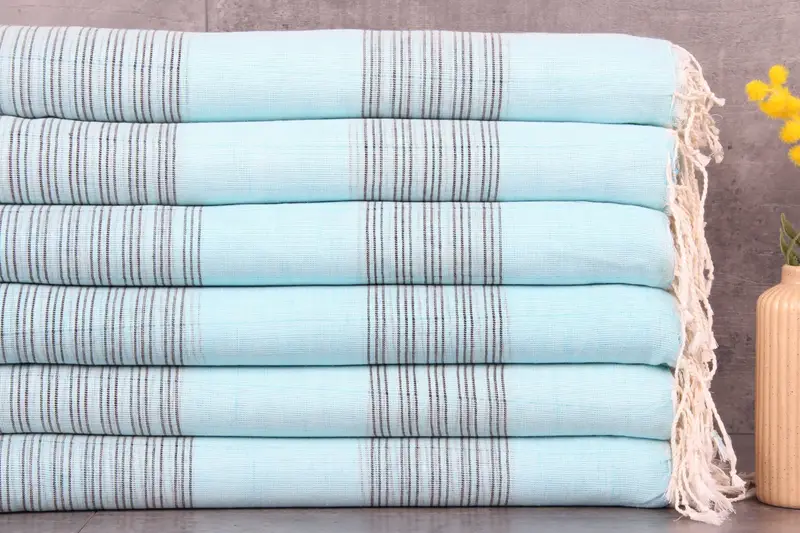 The Organic Beach Towel, characterized by its material composition, is crafted from 100% organic Turkish cotton. Resulting in superior absorbency, the towel ensures moisture wicking and quick drying, making it suitable for beach or spa use. Weighing 160 grams per square meter, the towel measures 38x71 inches or 95x180 centimeters, with hand-weaving tolerances of 1-2.5cm.