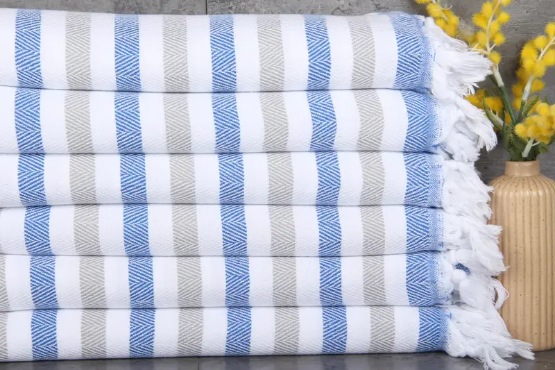 Turkish towels, characterized by their use of 100% organic Turkish cotton, ensuring a natural dyeing process. Measuring 40x63 inches (100x160 centimeters) and weighing 380 grams, these towels are produced using hand looms with tolerances of 1-2.5 cm. Turkish towels are pre-shrunk and require separate washing for the first 2-3 uses, subsequently wash-able at 30-40°C with low cycles.