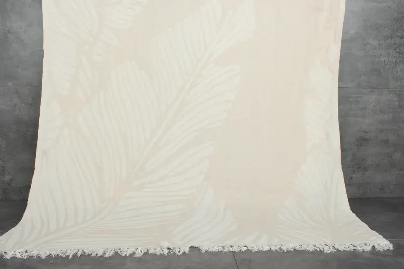 The product is characterized by its fiber composition, featuring 100% organic Turkish cotton, ensuring a natural dyeing process and superior absorbency. Each beach towel measures 40x71 inches or 100x180 centimeters, with a weight of 320 grams, resulting in durable and cozy utility. Tolerances for hand-weaving vary between 1-2.5 cm.