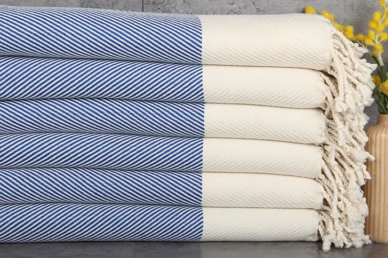 The Custom Turkish Towels are composed of 100% organic Turkish cotton, ensuring high durability and superior absorbency. Each towel, resulting in a weight of 430 grams, measures 71x40 inches, equating to 180x100 centimeters. The hand-weaving process allows for tolerances of 1-2.5 cm in dimensions.