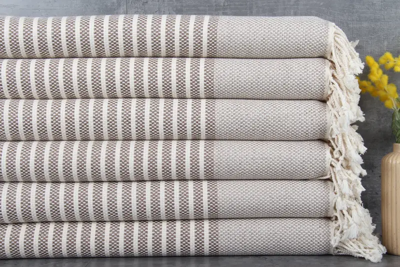 Turkish towels are characterized by their 100% organic cotton composition, ensuring superior absorbency and durability. These towels exhibit dimensions of 40x75 inches (100x190 cm) and a weight of 400 grams per piece, with allowable hand-weaving tolerances ranging from 1-2.5 cm. This results in a robust product capable of withstanding rigorous use.