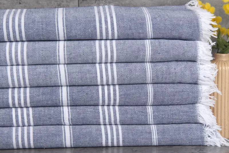 Turkish cotton beach towels are characterized by their 100% organic Turkish cotton composition, resulting in enhanced absorbency. Organic cotton towels measure 36x67 inches (90x170 centimeters) and weigh 160 grams per square meter. Hand-weaving tolerances allow for variations within 1-2.5 centimeters.