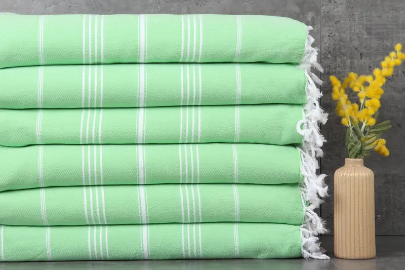 Turkish towels, distinguished by their %100 organic Turkish cotton composition, ensure superior absorbency and durability. These towels, characterized by their natural dye colors, maintain their softness and style through each wash, resulting in enhanced water absorption. Each towel measures 40x71 inches or 100x180 centimeters, with a weight of 260 grams, and features a hand-weaving tolerance of 1-2.5 cm.