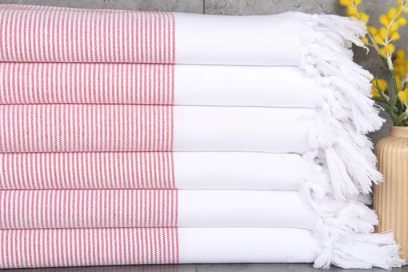 The Turkish towels are characterized by their 100% organic Turkish cotton composition, resulting in superior absorbency and softness. Each towel measures 40x71 inches or 100x180 centimeters, with a weight of 290 grams, ensuring durability and comfort. Production tolerances for hand-woven items are within 1-2.5 centimeters, providing consistent quality.