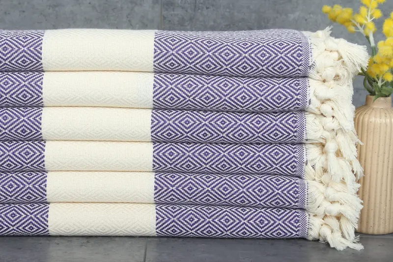 Characterized by %100 organic Turkish cotton, the towels ensure a premium fiber composition. Made through natural dyeing, the towels maintain the integrity of the organic fibers, resulting in a softer and more absorbent product with each wash. Weighing 420 grams, the dimensions are 40x71 inches or 100x180 centimeters, with hand-weaving tolerances of 1-2.5 cm.