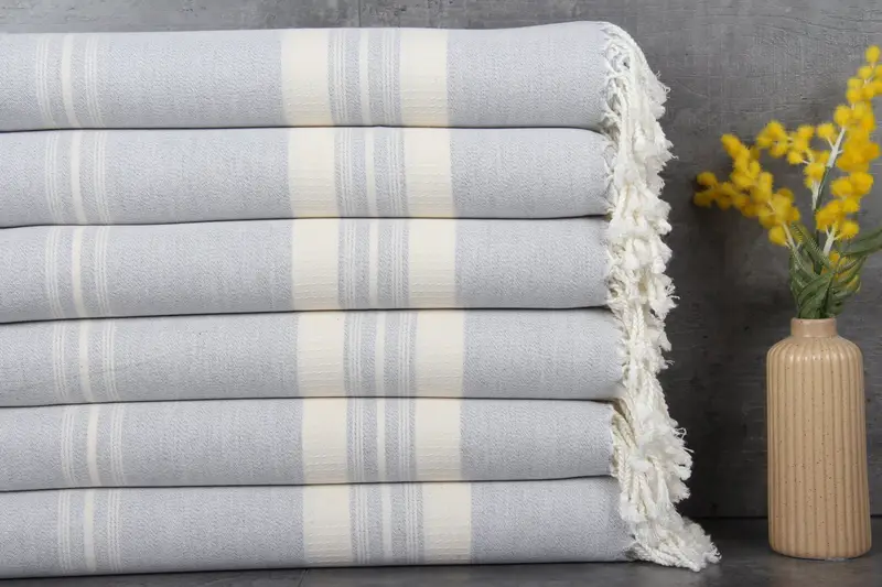Organic cotton ensures the fiber composition of these towels, characterized by natural dyeing and superior absorbency. Weighing 250 grams, the towels measure 38x60 inches or 95x150 centimeters, with a hand-weaving tolerance of 1-2.5 cm. Hand-loomed with precision, the towels achieve a pre-shrunk status, ensuring consistent sizing after each wash.