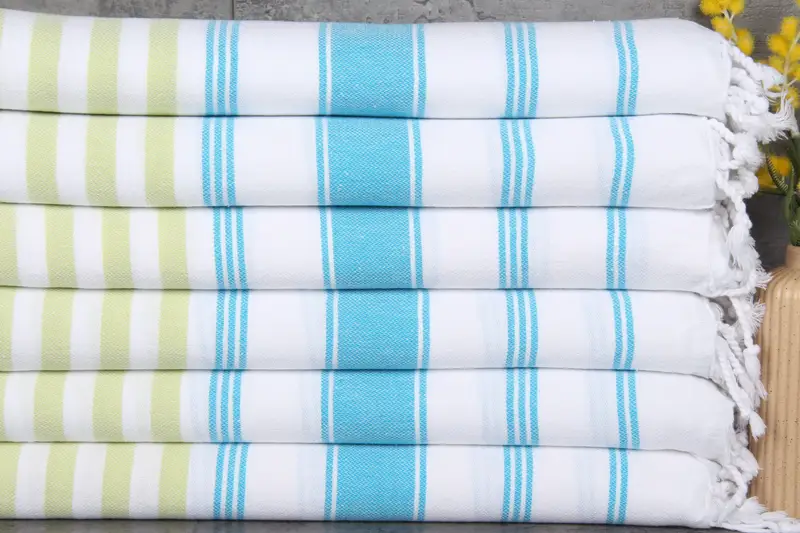 Characterized by its superior absorbency, the Turkish beach towel is composed of 100% organic Turkish cotton, ensuring durability and enhancing water retention over time. Measuring 40x71 inches (100x180 centimeters) and weighing 300 grams, the towel accommodates natural hand-weaving tolerances of 1-2.5 cm. The product's pre-shrunk status and customization options for embroidery are meticulously managed, with an option for expedited processing upon request.