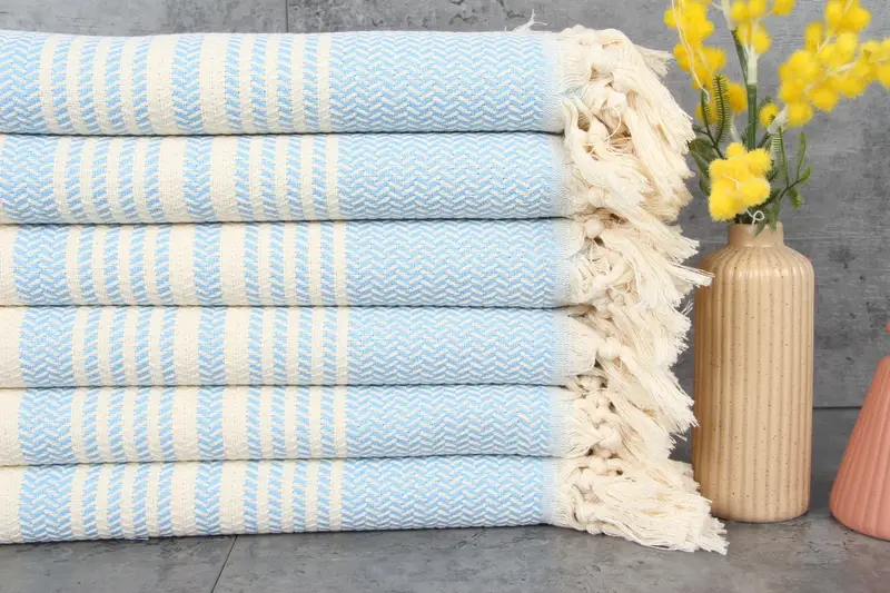 Dimensions for the towels are standardized at 40x71 inches or 100x180 centimeters, with hand-weaving tolerances between 1-2.5 centimeters. These specifications result in towels that are pre-shrunk, ready for immediate use, and ca...