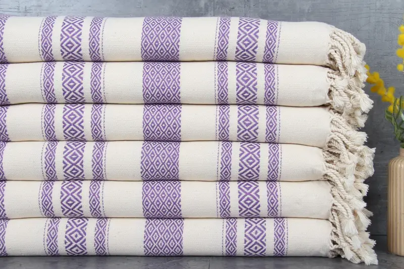 Characterized by %100 organic Turkish cotton, the Turkish towels exhibit exceptional fiber composition. Ensuring superior absorbency, they are made using natural dyes that maintain color integrity over successive washes. Resulting in a consistent weight of 400 grams, the towels measure 36x71 inches (90x180 centimeters), with a hand-weaving tolerance of 1-2.5cm.