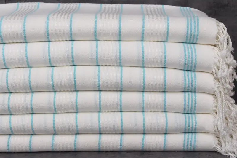 Organic cotton fibers, ensuring superior absorbency and softness, are integral to the Turkish towels' construction. The towels, weighing 260 grams, feature dimensions of 40x71 inches or 100x180 centimeters. Variations in hand-weaving tolerances are expected within 1-2.5 cm.