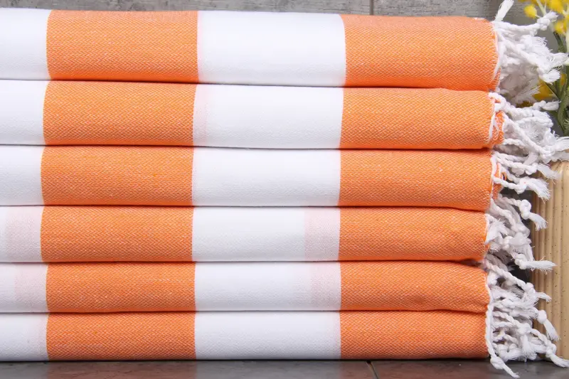 These beach towels are characterized by their vibrant orange and white striped design, with a secondary beige hue. Each piece is naturally dyed, preserving the environmental ...