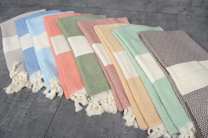 Ensuring high-quality fiber composition, these Turkish towels and blankets are made from 100% organic Turkish cotton, characterized by natural dyeing. Resulting in superior absorbency, each towel has a GSM of 220 grams/sq. meter, and dimensions of 40x70 inches or 100x180 centimeters. Tolerances in hand-weaving may vary by 1-2.5cm.